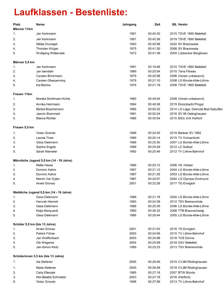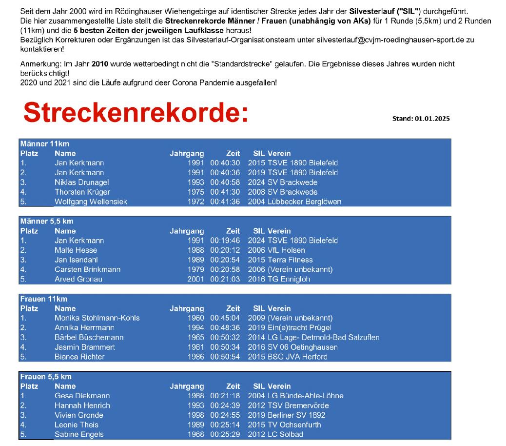 Seit dem Jahr 2000 wird im Rödinghauser Wiehengebirge auf identischer Strecke jedes Jahr der Silvesterlauf ("SIL") durchgeführt. Die hier zusammengestellte Liste stellt die Streckenrekorde Männer / Frauen (unabhängig von AKs) für 1 Runde (5,5km) und 2 Runden (11km) und die 5 besten Zeiten der jeweiligen Laufklasse heraus!